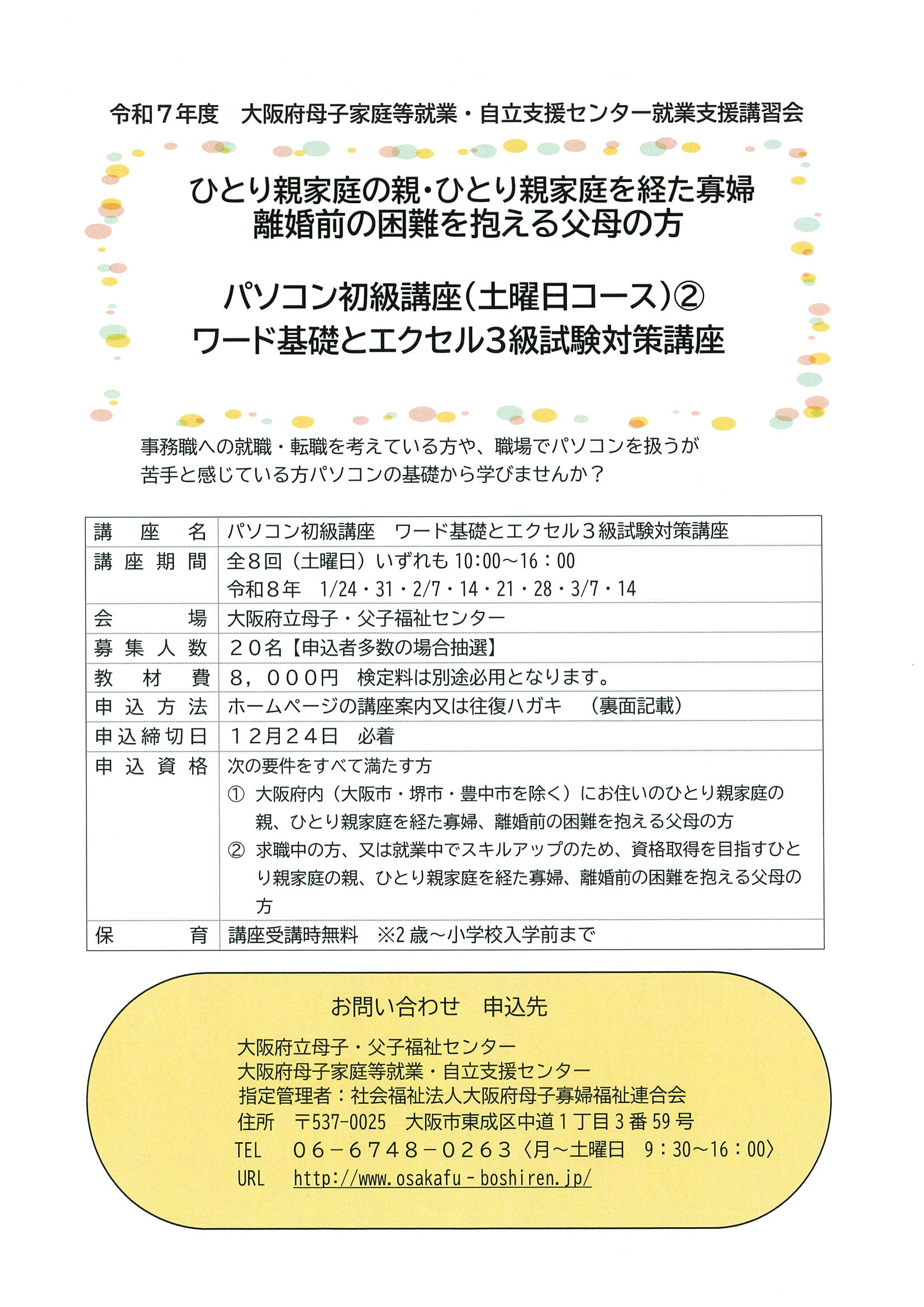 母子家庭等就業・自立支援センター職業紹介所 電話 06-6748-0263(職業紹介担当)