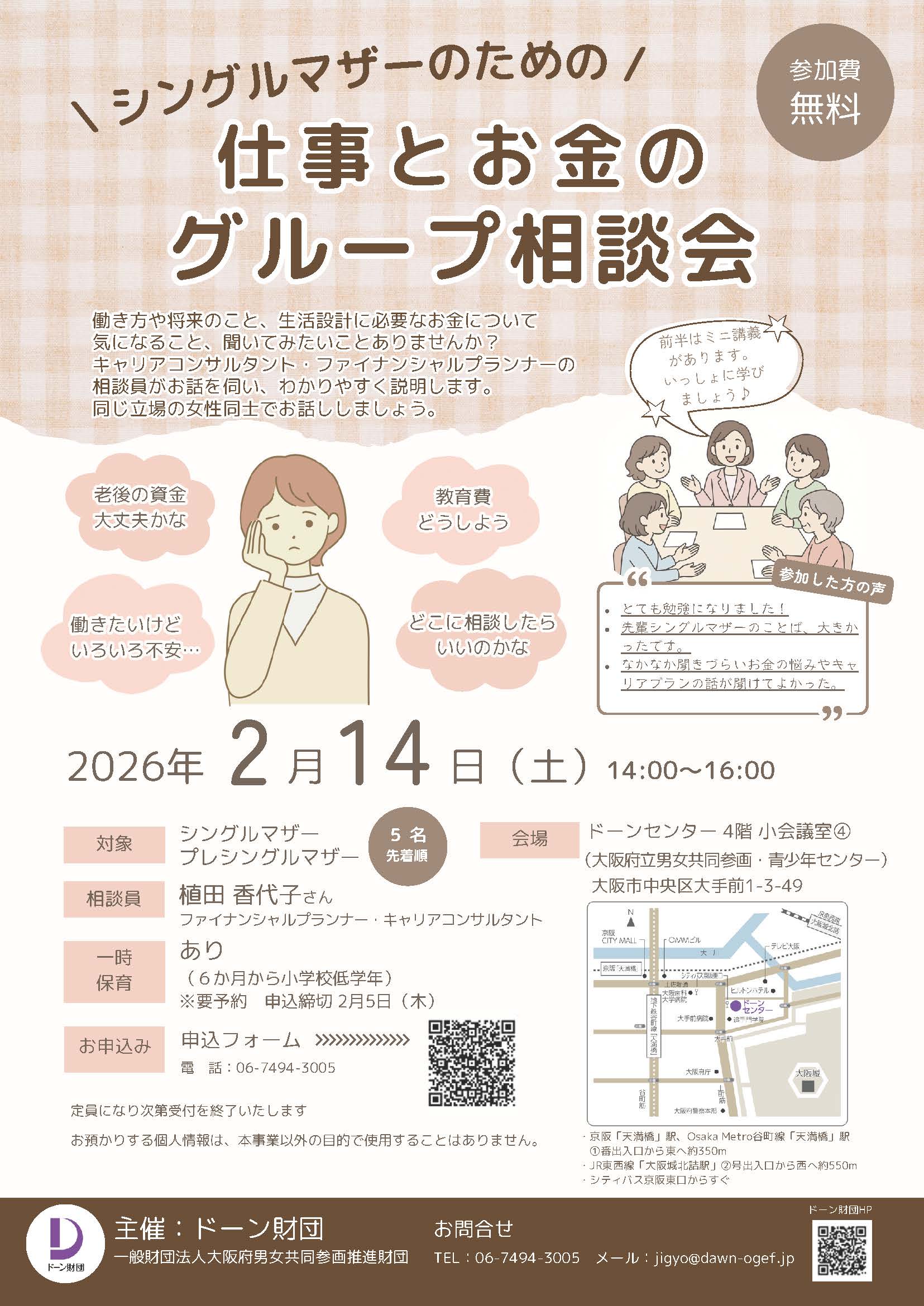 2/14(土)シングルマザー・プレシングルマザーの方を対象とした仕事とお金のグループ相談会を開催します。 働き方や将来のこと、生活設計に必要なお金について気になること、聞いてみたいことありませんか? キャリアコンサルタント・ファイナンシャルプランナーの相談員がお話を伺い、わかりやすく説明します。 同じ立場の女性同士でお話ししましょう。 どうぞお気軽に、安心してご参加ください。 2/14 シングルマザーのための仕事とお金のグループ相談会 詳細はこちら⇒ https://www.dawn-ogef.jp/archives/5117 【日 時】2026年2月14日(土)14:00~16:00(受付13:45~) 【対 象】シングルマザー、プレシングルマザー 5名(先着順) 【相談員】植田香代子さん (ファイナンシャルプランナー/キャリアコンサルタント) 【会 場】ドーンセンター4階 小会議室4 【参加費】無料 【一時保育】あり(6か月から小学校低学年程度) ※要予約 2/5(木)まで 【申 込】申込フォーム ⇒ https://forms.office.com/r/vi7hE5rAjV 【主 催】ドーン財団(一般財団法人大阪府男女共同参画推進財団)