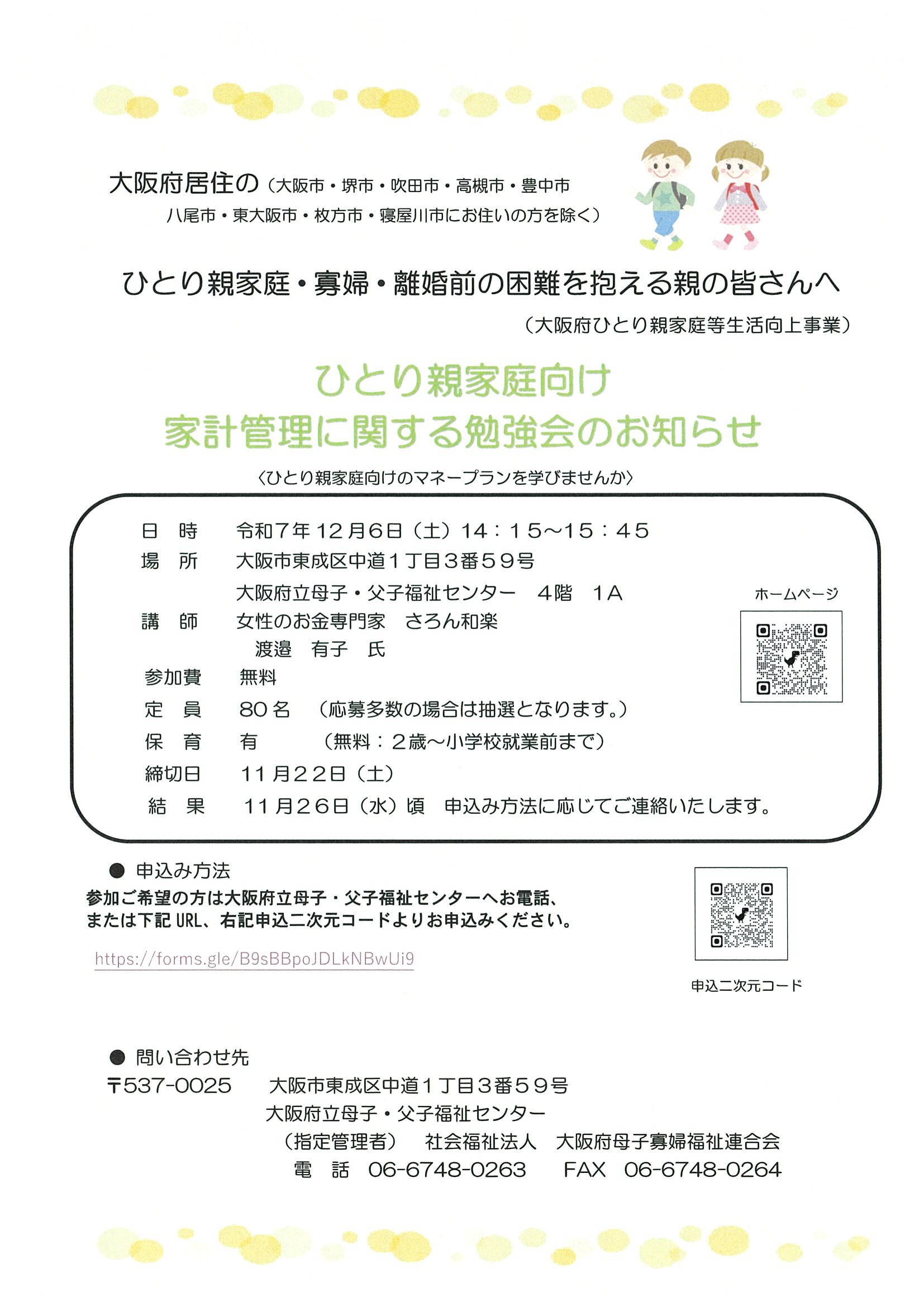 大阪府ひとり親家庭等生活向上事業 <家計管理に関する勉強会> 参加者募集中