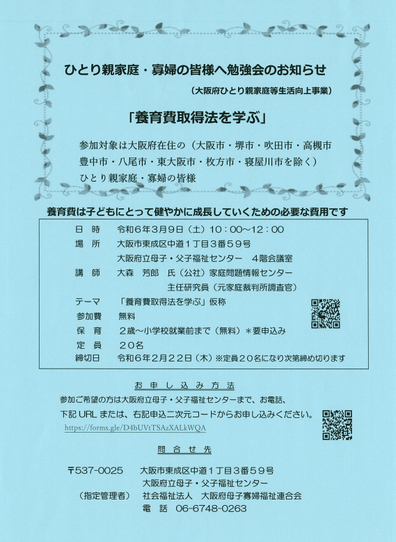 申込先 大阪府母子寡婦福祉連合会 電話06-6748-0263 FAX06-6748-0264