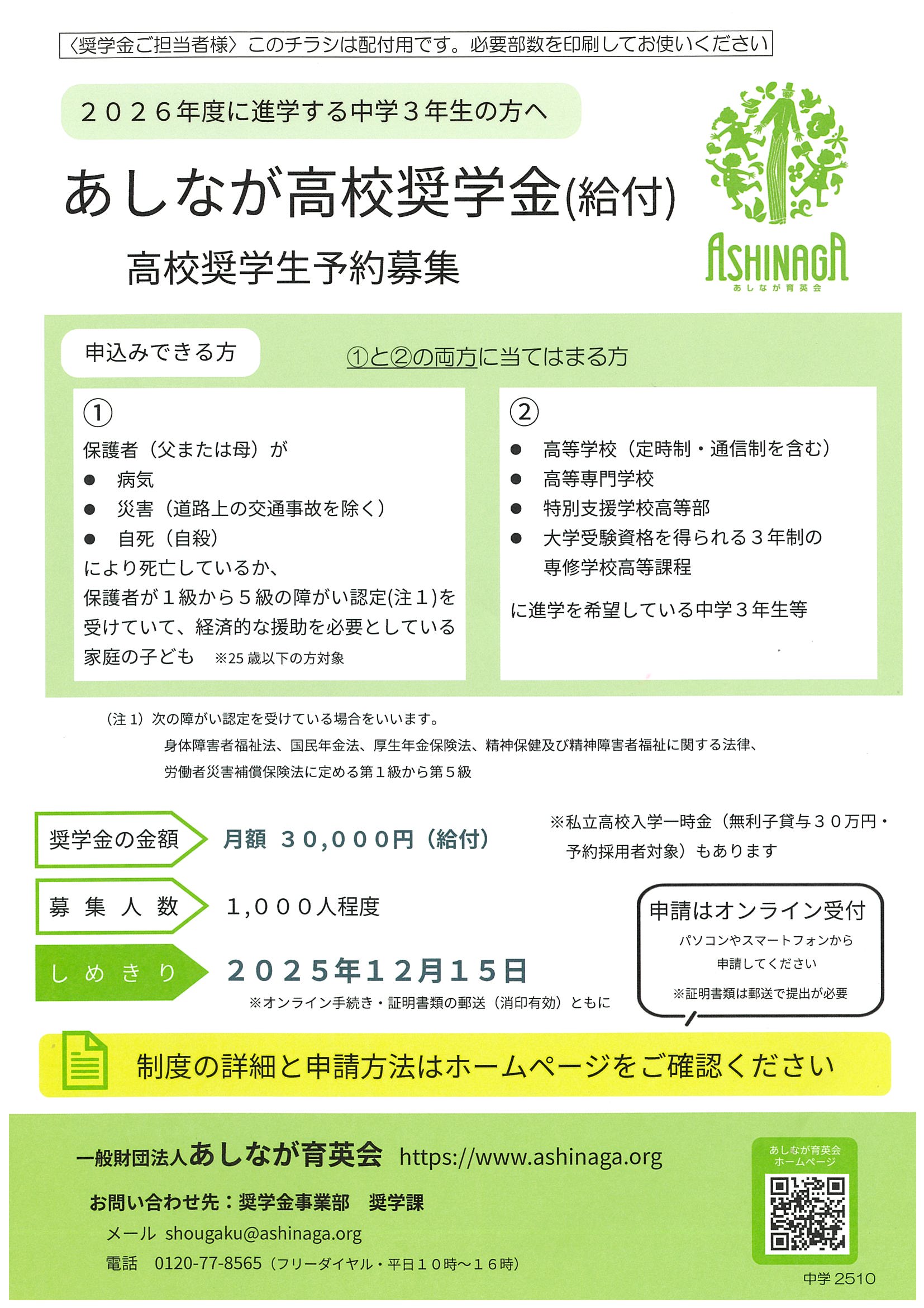 2026年度に進学する中学3年生の方対象、高校奨学生予約募集しております。