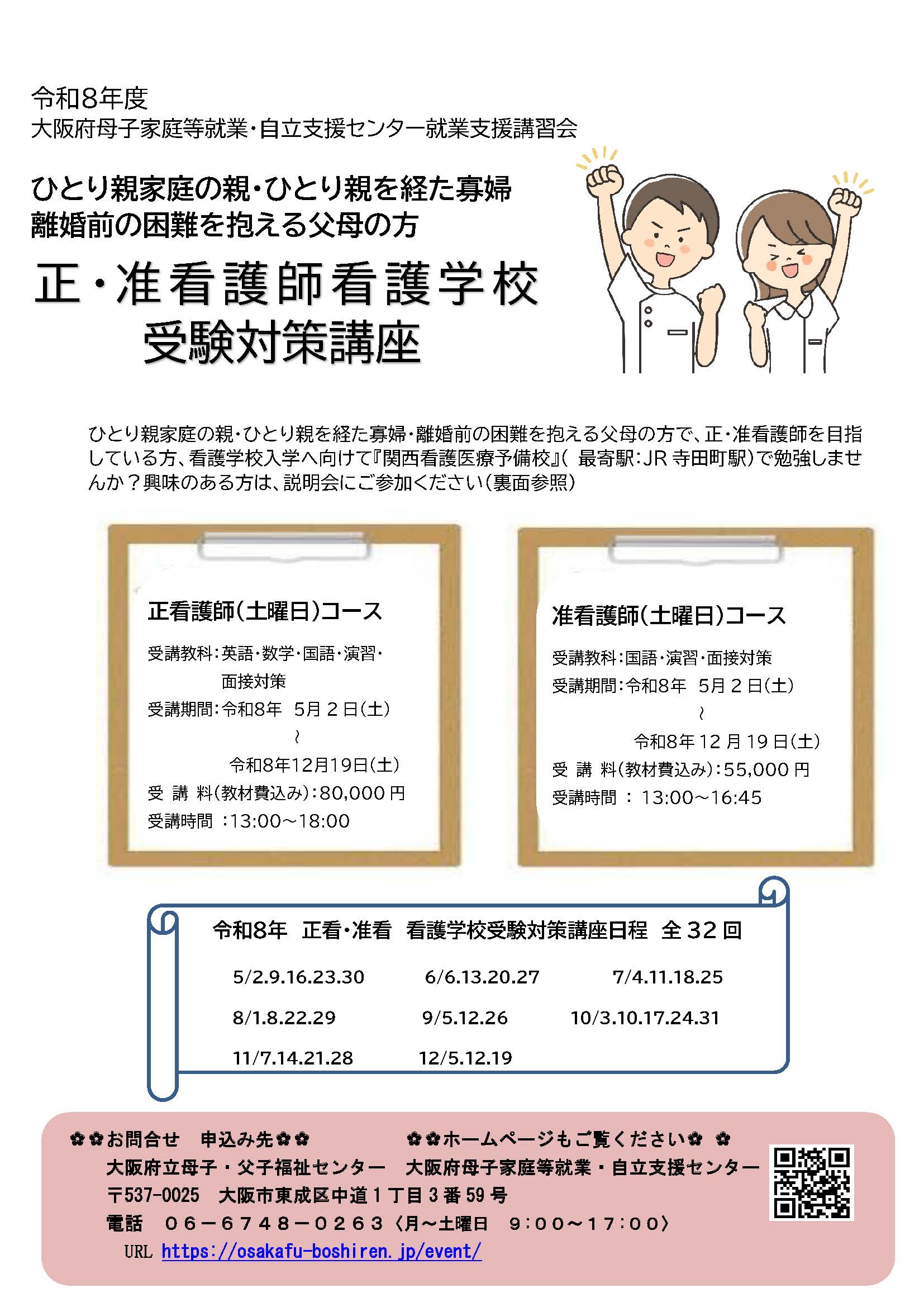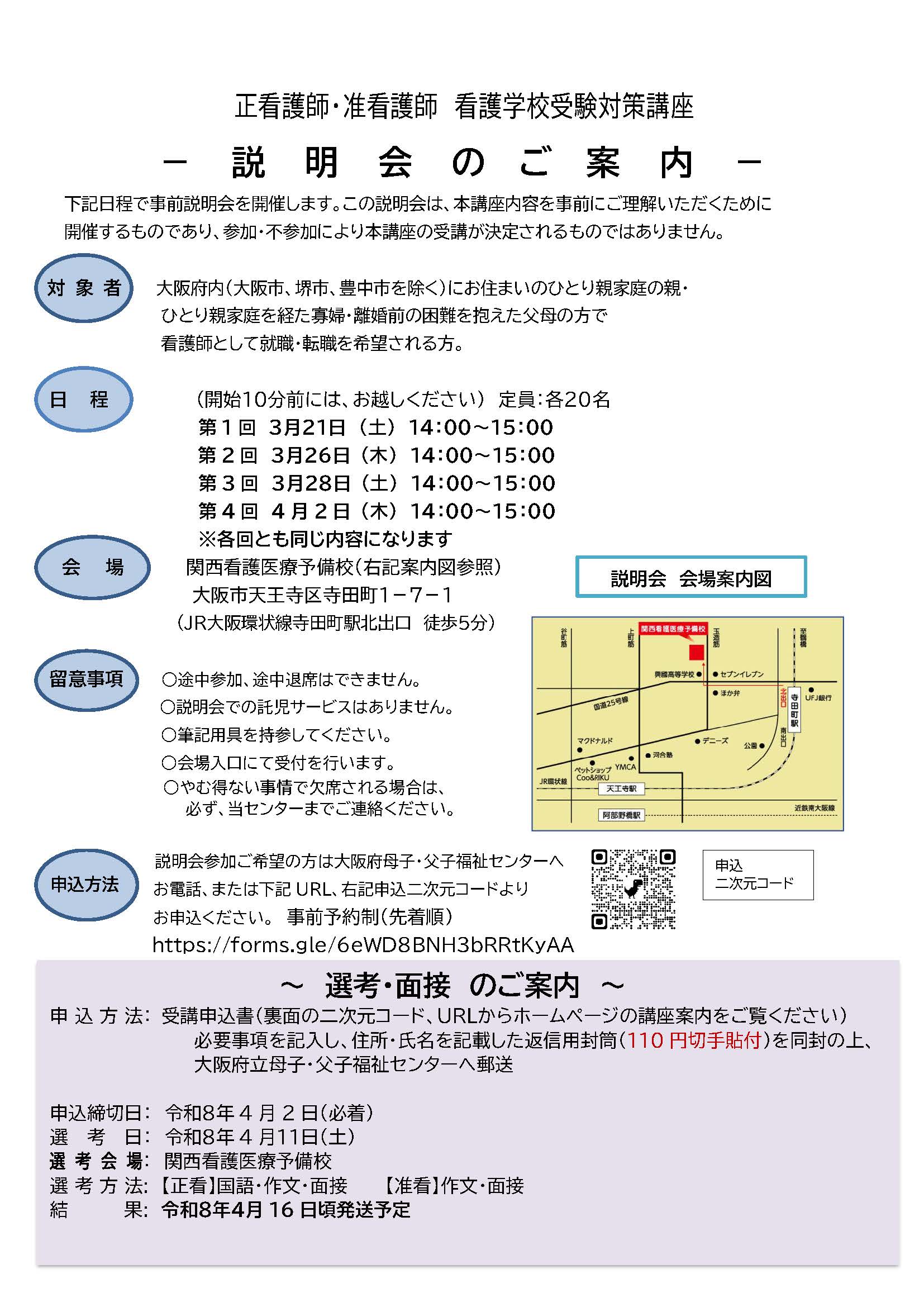 ひとり親家庭の親・ひとり親を経た寡婦・離婚前の困難を抱える父母の方で、正・准看護師を目指している方、看護学校入学へ向けて『関西看護医療予備校』( 最寄駅:JR寺田町駅)で勉強しませんか?興味のある方は、説明会にご参加ください。