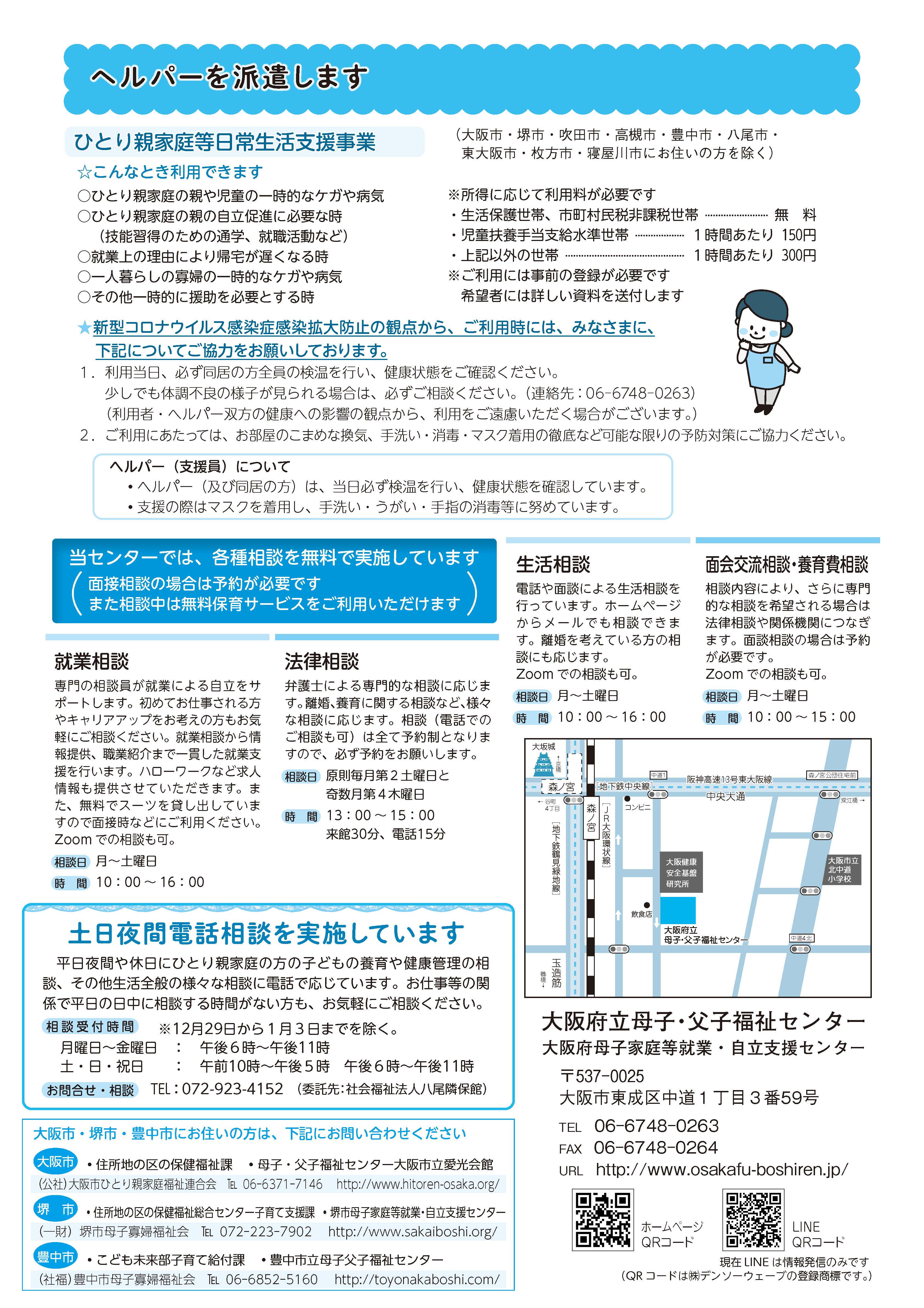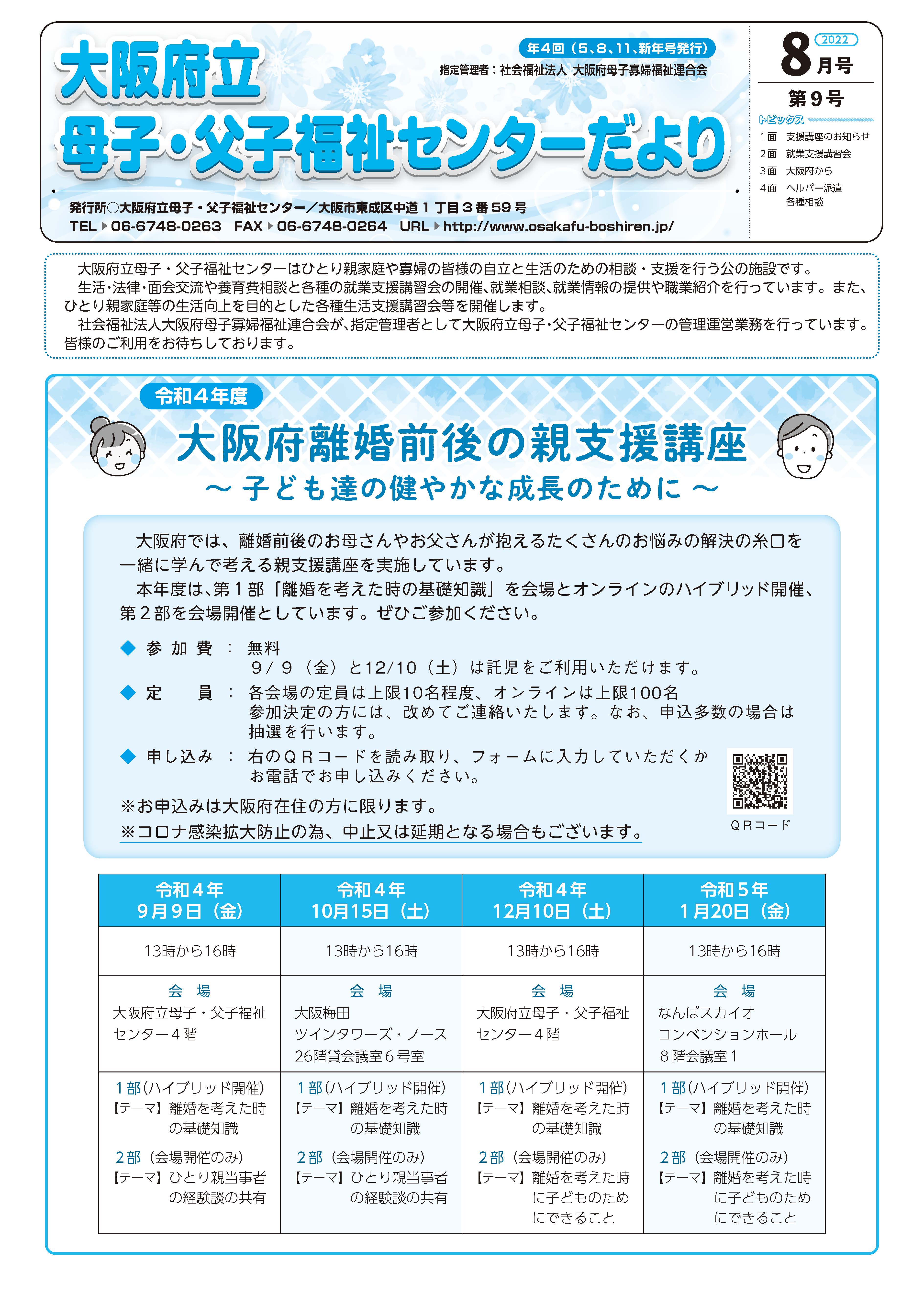 大阪府立母子・父子福祉センターでは、年4回の親支援講座を開催いたします。